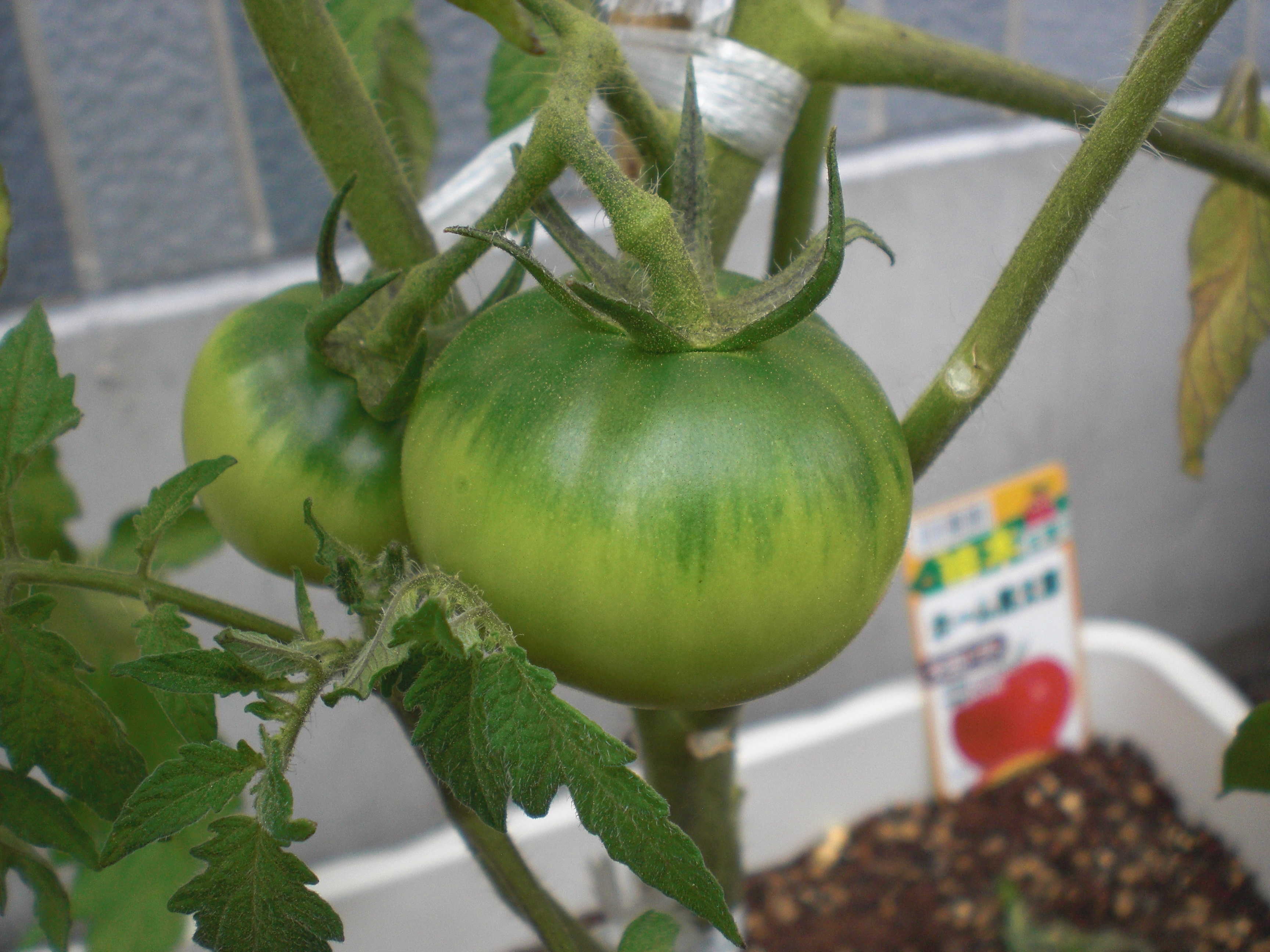 となりの大きくなる予定のトマトは、緑色ですが、立派に成長を遂げていました。