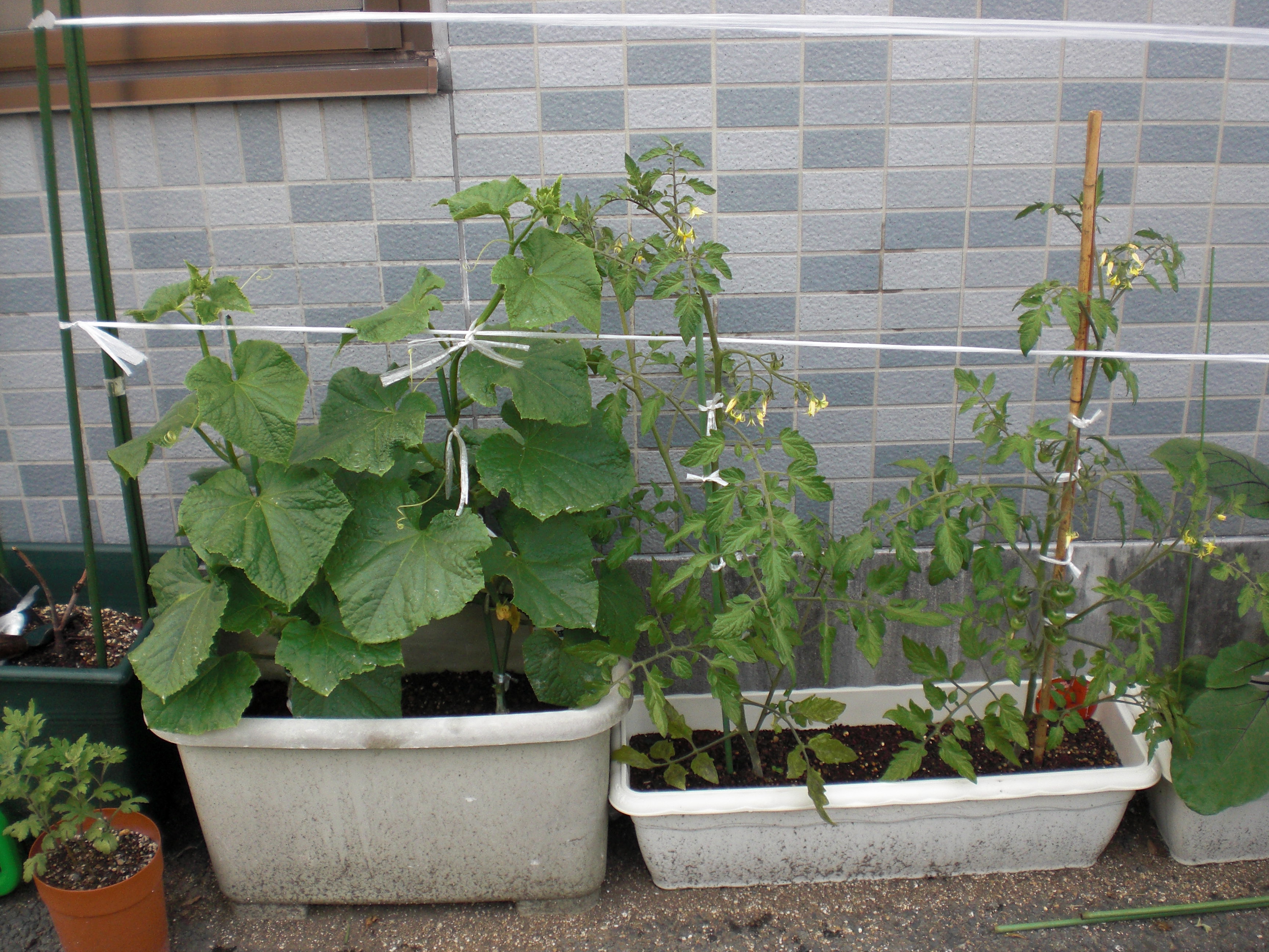 今日、以前に植えた、ナス、キュウリ、トマトの苗が大きくなって