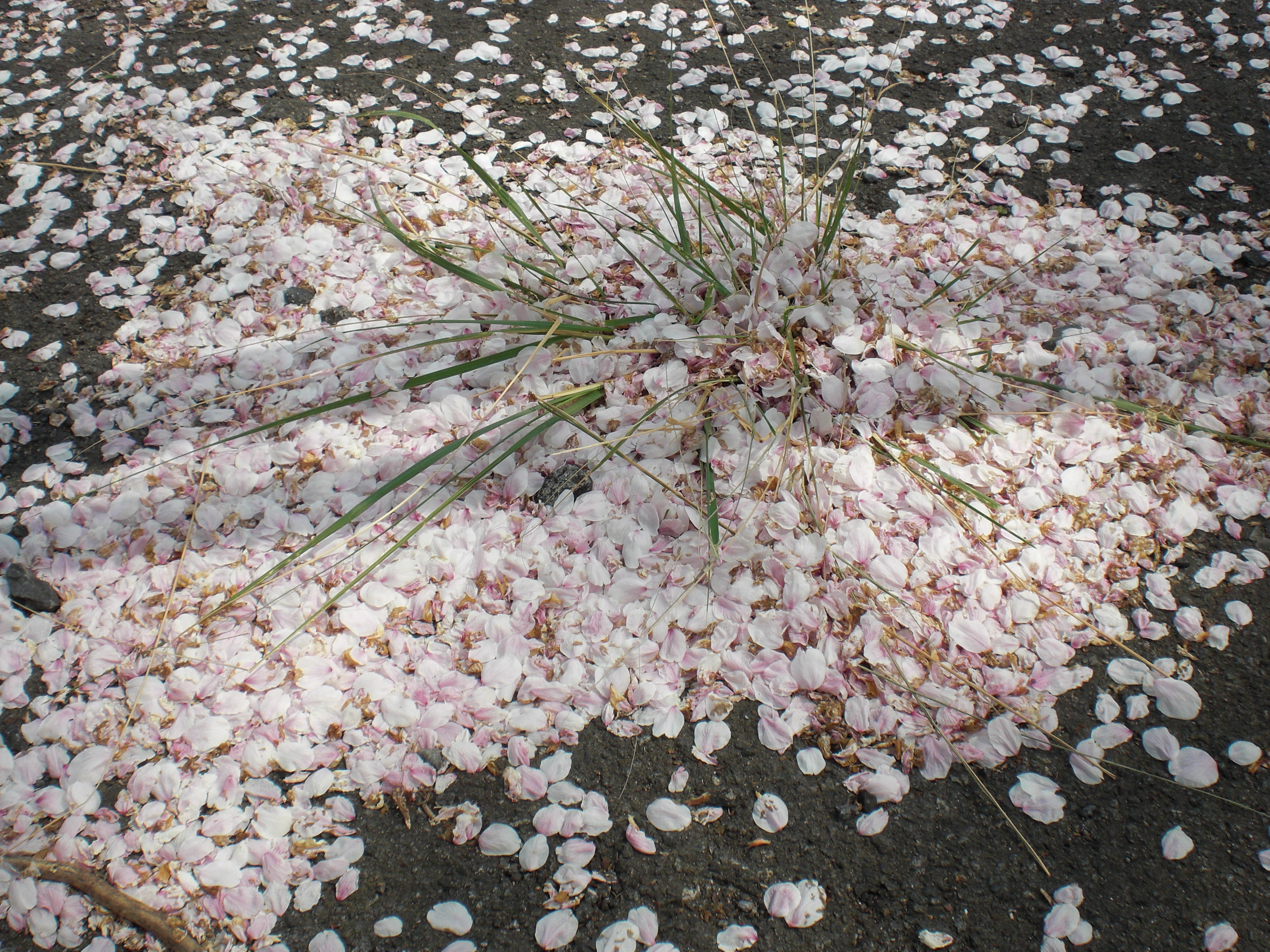 桜の花も散って、木の下一面が桜の花びらが散らばっています。