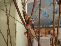玄関の桃の花のつぼみがピンク色にふくらみ始めました。
