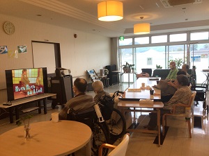 今日は2階でカラオケタイム!3階から入居者様もあつまりよろしく~とご挨拶。歌が聞こえたので起きたいという方も。楽しい1.5時間でした。暑い暑い(-_-;) 冷たいお茶が人気でした!