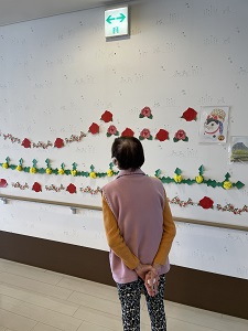 桜はしだれ桜を作っており、同じように用紙の色を変え、利用者様にお手伝い頂き作りました。