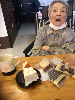 お誕生日おめでとう~!とご家族様が来所されました。元気になったね、安心したよ。ケーキとお菓子のプレゼント🎉 ご家族の会話が聞こえてくすっと笑ってしまいました。大変失礼いたしました。雨の中ご来所ありがとうございます。今日も元気に過ごせています(∩´∀`)∩ この後すぐケーキ飯がられました。明日は施設でお誕生会を予定しております。何度も祝いましょう㊗