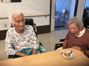 お誕生日ケーキをつくってもらいました!ろうそくの文字は。。。もちろん104 ハッピーバースディの歌をみんなで合唱。そのみなさんで甘いケーキによばれました。お祝いムードにつつまれてほんわか。