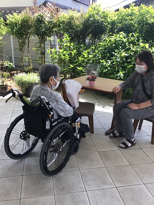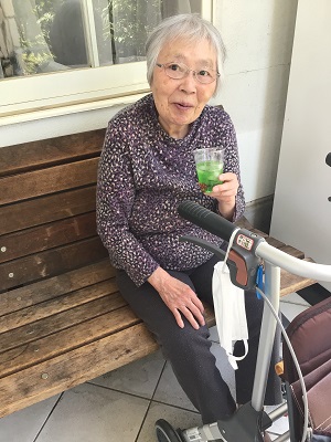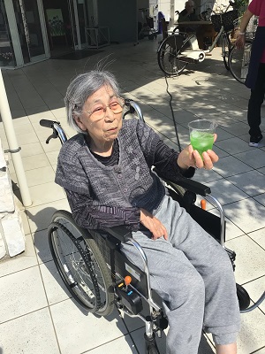 今日は暑いくらいの快晴 入居者様にアナウンス声掛けし1枚脱いでくださいとお話しますが、暑くないよとの返答がしばしば。。。こうなったらと、水分チャージ 外でメロンソーダを。懐かしい味だと喜んでいただけました。そして飲み干されるのをみると企画としては成功!ですね また久しぶりに訪問されたご家族様も何組か (撮影時のみマスク外しております)施設スタッフとしてもご家族様がおかわりなくされているのを見て安心をいただきます。