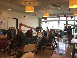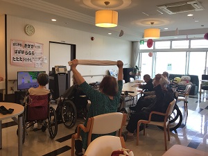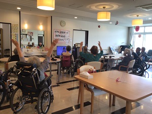2階の利用者様は大きな声で唄って下さり、3階の方々は真剣にお身体を動かし体操に参加して下さいました。