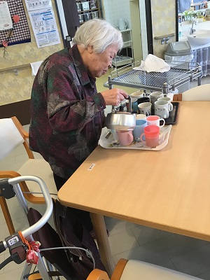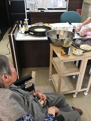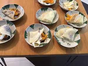 材料がある!とのことで急遽手作りおやつを。慣れたスタッフの動きが早い早い。。クレープをいきおいよく焼きはじめあんことみかん、生クリームで盛り付け。入居者様もお手伝いしてくださり午後は甘い匂いが漂い誘われていました。濃いほうじ茶と。