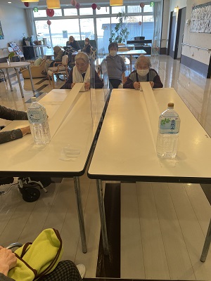 こんな遊びをしました(*’▽’) テレビでみたのですが、トイレットペーパーに1リットルほど水を入れてそーーーーっと引っ張る どちらが先にゴールするかの勝負です。ペーパーが切れたらやり直し これが地味に盛り上がりました。こんなのはじめてやるから、と言いながら中にはつわものがおり3連勝の成績をのこされました。「楽しかった」と聞くと本当にうれしい。また、お手玉がでてきたので座って玉入れ 数回行い、1回目より2回目は多く入れましょうという形に。
