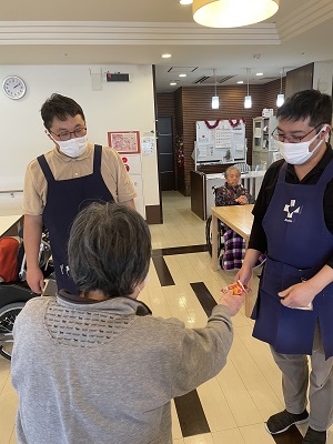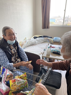 今度はカートを使って入居者様と各居室を回りました!バレンタインの妖精です♪ハッピーバレンタイン❤と手渡し。笑顔がたくさん引きだせました~!