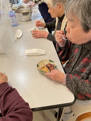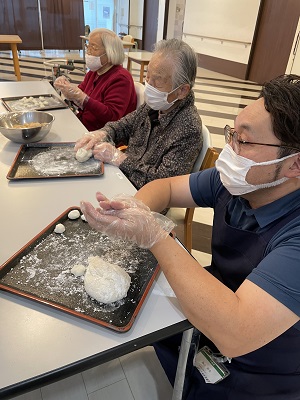 感染の観点から今年も餅つきはできませんでしたが、餅つき機ががんばってくれました。そして入居者様のがんばりが加わり本日のおやつとなりました!からみ・つぶあん・きなこ 食べやすい大きさに丸める作業を無言で手伝ってくださった方たちに1番目に召し上がっていただきました。感想はというと「ちょっと固くなっちゃった」(笑) なのでした♪ 全面協力シップヘルスケアフードさんありがとうございました