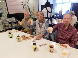 久しぶりに太陽が出た気がします☀施設の中、朝は少し暖房を入れましたが、だんだんと暑くなり昼近くにはエアコンは冷房に。寒暖差?すごい 今日は入居者様よりスタッフの方が楽しみにしていましたイベント食 秋祭!大々的にお祭りですとできない事情。お祭りの気分だけでもと思いスタッフが企画してくれました。まず第一部としお食事を楽しんでいただきました☺ ノンアルで乾杯される皆様 笑顔素敵ですよね。雰囲気に酔って閉まれている方も・・!