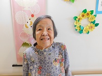 ひまわり飾りの前で