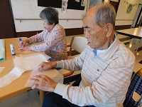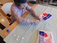 制作の風景段階に入り、雲を作成しようとお花紙を小さく”ちぎり・・・まるめ・・・貼付け・・・ちぎり”を繰り返し行いました。