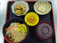 本日の昼食は、ご当地グルメ《 宮崎県編 》です!宮崎駅で販売されている駅弁に『椎茸めし』というのがありとても人気の駅弁だそうです !(^^)! 今日の昼食は『椎茸めし』を参考に献立されております🍱