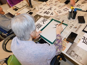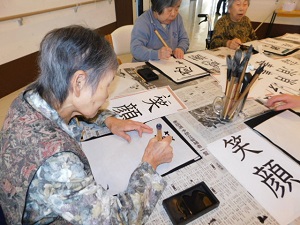 今日も今日とて寒い一日です。施設の中では汗をかいています笑 本日のレクリエーションは書初め コロナ禍で閉塞感がある生活ですが、何か明るい言葉をと思い選んだのが「平和」「笑顔」など。お正月などももちろんあります。賢い方は見本を下にひきうつされていました(笑) さすがです。 面白ネタでは「消毒」の文字もありました。
