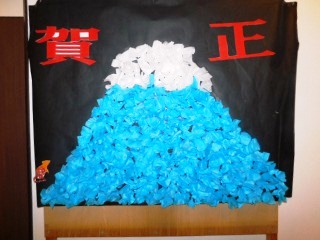 皆さまの協力を得て力作が・・・‼お披露目です。3D?の富士山と壁面富士山にはねずみの絵馬のように皆さんお願い毎が。少しずつが大きな作品になるのはうれしいですね。