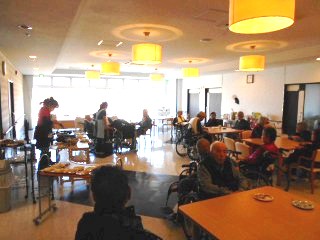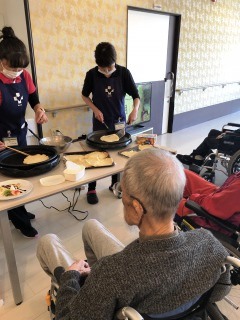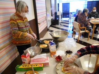 17日の午後 Ⅲ番館の1階はいい匂いに包まれました。それぞれが準備したものを入居者様が仕上げていくといったコンセプト。Ⅲ番館は入居者様がパンケーキを焼いて焼いて焼きまくる。慣れた手つきで上手。。。私は焦がしてしまい離脱。向き不向きがあるもんだ。と思うのでありました。フルーツをカットするひと、盛り付ける人と分担し作業はスムーズ。打ち合せなくうまくいくもんですね笑