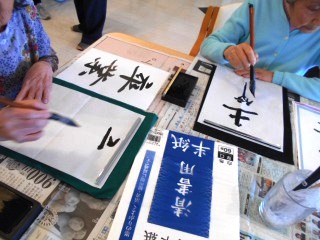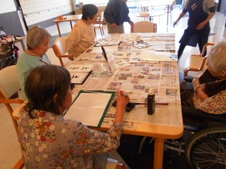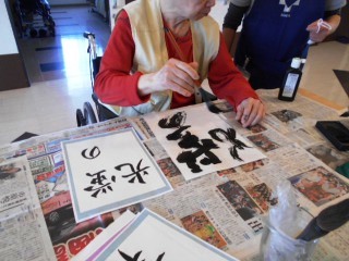 雪が思った以上に降らなかったので通常運営中です(*^。^*)今日は習字の時間 お手本をみてまたお手本以外に今欲しい物を書いたり。。。このあと入居様はご家族にシュークリームを買ってきもらっていました笑 作品は展示して楽しんでいただいております♪