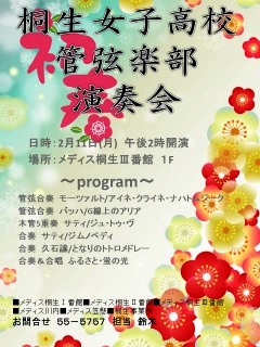 2月11日桐生女子高校管弦楽部演奏会 オーケストラの音色をお楽しみいただきます。