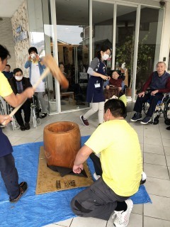 おいしい餅がたべたい‼皆様の希望を叶えました。「よいしょ~‼よいしょ~‼」の掛け声。入居者様の声も響きます。今日もとっても冷たい日なので中から見物される方が多かったのですが気合をいれ近くで見学される方も。ぺったんぺったん。季節の音が鳴り渡ります。