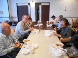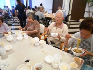 そんな高橋ブラザーズさんより申し出が‼演技のあと入居者様が室内で食事をとっていたのですがそこでリベンジということで技を披露して下さることになりました。本領発揮ですね‼入居者様も大喜びでした。この日は祭メニューでスペシャルとしてラーメン・ポテト・からあげ・いももち・たこ焼き・かき氷 美味しくいただきました~♪何はともあれ、今年も秋祭無事終了です。皆様ご協力、ご参加していただきありがとうございました。もっと皆さんに楽しんでいただけるイベントができるよう一同しっかりとがんばってまいります。