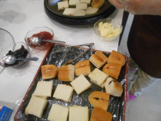 お楽しみ食事会パンバイキング パンは5種類用意しました。ウインナーや卵を挟んだり、トーストにバター&ジャムをたくさん付けて「おいしい~」と目じりとほっぺがさがってしまいました~♪