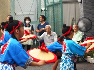 八木節のお囃子の音色に誘われ外に出てみるとかわいい子ども達が「やんちきどっこいしょ‼」の掛け声で八木節を踊っていました。入居者様も近くでみたいと椅子持参で道路を渡り見学へ。ほんと子どもが年長さんかな小学低学年かなといったところすっごくかわいいかったです♡
