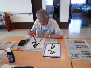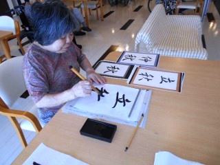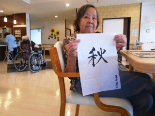 今回は習字の時間。2階と3階で開かれました。テーマはずばり秋。お見本が重要です。秋・秋桜・九月・中秋・栗ごはんなどを見本に。みなさん思い思いに筆をとっていました。以上、習字の時間でした(*^。^*)