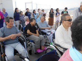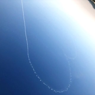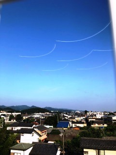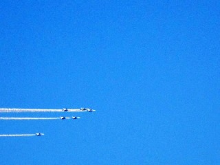 今日は少し靄がかっていましたがまずまずの天気。16時半開始とアナウンスされていましたがブルーインパルスが見え時始めたのは16時40分でした。10分がとても長く感じました。Ⅲ番館の屋上にはたくさんの人が集まり登場をまつばかり。颯爽と雄々しく登場した飛行部隊6機。最初に6輪の花がさきました。大歓声、私たちも興奮してしまいます。