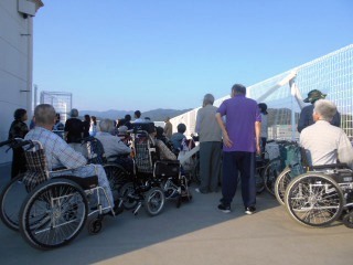 展示飛行をみているみなさんの様子です。子ども連れのスタッフも集合です。飛んでいるブルーインパルスは肉眼では小さくはっきりと見えませんでしたが最初の6輪のあとは2機で♡を、最後は6機でストレートラインをみせてくれました。とてもはしゃいでしまいましたが感動をありがとうと言いたいです。やるな桐生‼がんばれ桐生‼と思うのでありました。。
