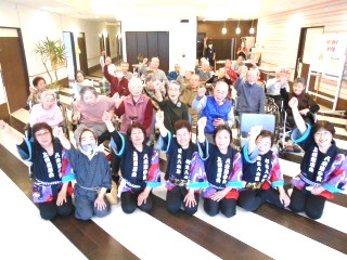続き⇒マジックでも入居者様を誘い、楽しませてくれます。それから安木節・・短時間での早着替えと化粧 尊敬します。今日は1番館からのお客様とⅢ番館の入居者様38名が参加されました。最後は最高の笑顔で集合写真。掛け声は「春だよ‼全員集合‼」ありがとうございました‼