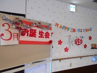 お誕生会で~す♪♪3月は6名様がお誕生日を迎えました(*^。^*)今回のケーキは桜風味の蒸しパン♪皆様には素敵な写真たてがプレゼントされました。皆様が健やかに1年過ごせますように。。スタッフ一同