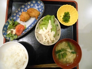 本日は唐揚げ♬鶏肉が苦手な人は豚に変更して提供しております。お肉が苦手なかたは餃子や玉子焼きに変えております。