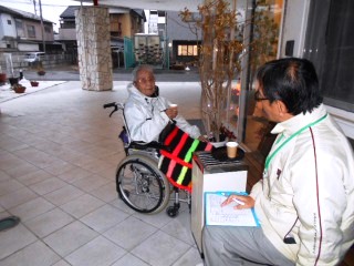 17日の午後天気予報通り雨が降り出しました。どんよりとした空から冷たい雨が落ちます。外の花壇にも水が滴ります。気温がそこまで低くないため雪にならないのかなと入居者様やご家族様と話ておりました。そんな中入居者様とお客様で外でコーヒー&喫煙タイム中 お話が盛り上がっているようです(*^。^*)