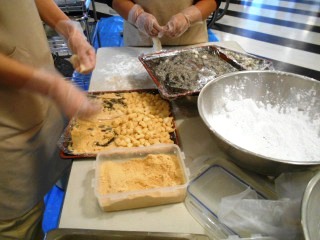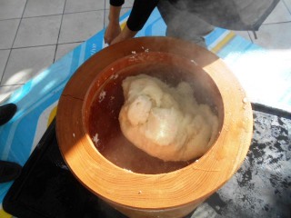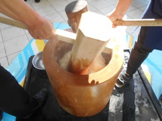 さぁ準備が出来ました‼杵2本でコネコネ。。コネコネ・・ぐるぐると。私もやりましたが全く役に立ちません。返しをするように言われましたが熱くてできません。コネコネが終りさぁみんなで合わせて「ヨイショっ‼」良い音が響きます。餅も飛んでましたが笑それもご愛嬌ですね