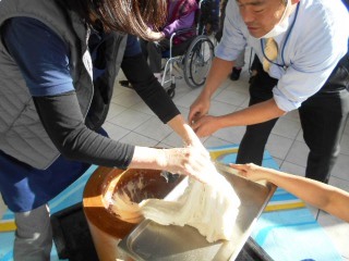 つきおわった後はゴマ・きなこ・からみ・おしること4種類。一番人気は今年もからみでした。いつもおせわになっているデンタルサポートの訪問歯科の先生方や衛生士さん、コーディネーターさんにもおすそ分け。つきたての餅は本当においしく最後は鏡餅ができてしまいました。(来年用でしょうか)入居者様皆様が喜んでいただけましたが、特に女性の方は夕飯いらないよというくらい召し上がっておられました。