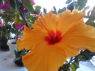 施設の中は花が元気いっぱいです(*^。^*)ハイビスカスとブーゲンビリヤ。少し前までアブラムシが大量発生し元気がなかったのですが、10日ほどで復活し生き生きと私たちを楽しませてくれています。大きく、しっかりと根付いてほしいですね。植物も、大切な人たちも。