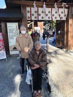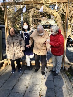 今朝は寒かった‼けれど陽がさすと暖かくなりこれは初詣日よりと思い初詣ツア-に行ってまいりました。第一弾は女性ばかり5名。場所は施設から車で15分弱、群馬大学工学部の近くにあります桐生天満宮神社へ。1年の健康をお願いしてまいりました。