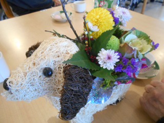 こんなかわいい子がきてくれました(*^。^*)といっても、花かごなんです。背中にお正月の花をしょって皆様をもてなしているようです。話題に触れるとみなさん笑顔になってしまいます。すごい癒し系ですね。あやかりたい‼