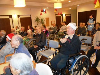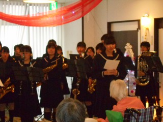 今年も明照学園 樹徳高校 吹奏楽部のみなさんがやってきてくれました‼樹徳の吹奏楽といえば最近はマーチングにも力をいれているようですがさすがに施設では披露はかないませんので、スタンドプレイで40名で40分演奏してくださいました。そして指揮をとられる渡辺教諭。いつもありがとうございます。今年も素晴らしい演奏を披露してくださいました。昨年から声楽も付加され私たちをたのしませてくれました。入居者様は「よかったよ~」と繰り返し・・私たちがプレゼントを頂いたのですがサンタの格好でいたのはスタッフと入居者様でした。あべこべですね。また来年もお会いできるのを楽しみにしております。