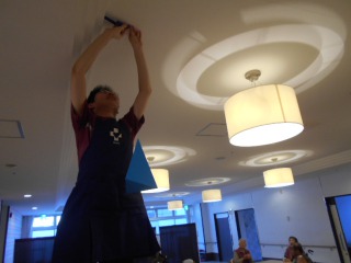 来週の準備をしております‼今日はツリーに見立てた色紙を天井からつるすのですが、男性スタッフにお願いしたところ「怖い」 脚立の上からみると高さを感じますもんね。結局S君には1個だけお願いして残りは私、がんばりました。それをみた入居者様は「そんなとこ登れるの?」「落ちないでね」と ありがたいですよね^_^;