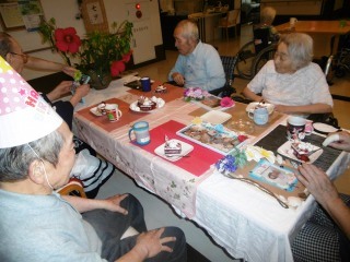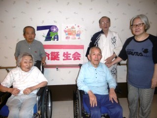本日30日の午後3時は7月生まれ5名様のお誕生会。手作りのプレゼントを渡し、「ほんとにうれしい」と笑顔。みんなでハッピーバースディを歌いケーキの食べ放題とまではいきませんがおかわりができました。健やかな1年が送れますようにお祈りいたします。