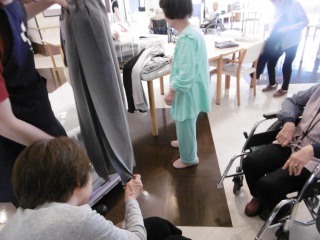 いつものテーブルに夏の洋服が並びました。「夏のズボンがほしい」との要望があり移動販売の藤屋さんの連絡すると早速来て下さいました(*^。^*)テーブルに並んだ服をあっという間に女性たちが囲みて手に取り、あーでもない、こーでもないと話に花がさきました。色々な施設にまわっている藤屋さん。また是非来て下さい。。