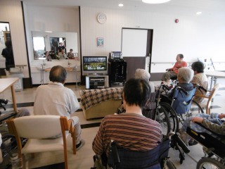 カラオケの後は、NHKテレビの体操をみなさんで‼もちろんスタッフも一緒です。唄って、体操をして本日のお茶、おやつにしましょうね。