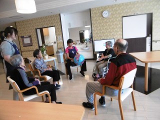 おはようございます(*^_^*)前日のレクのご報告になります。ボールを使ってのストレッチ普段使わない筋肉を使います。以外と難しいんですよね。狙った所にいかない気まぐれなボールに振り回されてしまう大人たちでした。悔しさを笑いに変えて今日一日元気にすごしていきましょう~♪