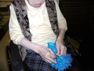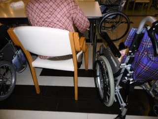 車イスのご利用者様が8割となっております。食事を摂る際のテーブルの高さってちょっと微妙なことが多くて食べにくい事もあると思います。車イスを足でこぐ(進める)方は低めの車イスのためテーブルとの差がひろがってしまいがち。そこでテーブルとセットの椅子をご利用していただくことに。良い姿勢で食事が摂っていただくことが出来ます。小さな取組からこつこつと‼桐生Ⅲ番館からでした(*^_^*)