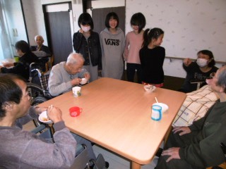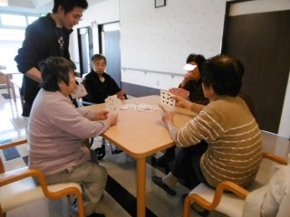 12月23日天皇誕生日にイベントを開催しました。コンセプトは『こころと体が温まる』ということで地元近隣の小学生、中学生また近隣の大人の方たちが参加してくださり入居者様とゲームや会話を楽しまれました(*^。^*)Ⅰ番館ではマジックショーで盛り上がり。その後Ⅱ番館、Ⅲ番館と各施設で準備したテーマにそったおやつ的なものを振る舞いました。Ⅲ番館はおやつというには「んっ?」ってなってしまいますが・・事前に冬・寒い・温まるから連想した「豚汁すいとん」を。ところがこの日はとても暖かく寒さはどこへやら 当てが外れてしまいました・・・(・_・;)でもでも おいしかったです。本当に。ただ入居者様は子どもらと普段みないような笑顔がみられとってもうれしかったです。包み込むような暖かさでうれしかったです。トランプ参加してくださり、来てくれた方々、ご家族様感謝‼
