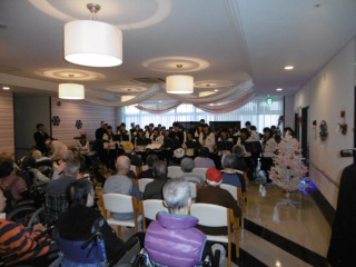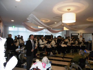 24日クリスマスイブ 明照学園樹徳高等学校の吹奏楽部のみなさんが来てくれました‼今年で3回目となる演奏会。今年はなんと40名の生徒さんが来てくれました!(^^)!正直うちの施設に入るんだろうか?と一瞬思いましたが、40名コンパクトにまとまり、観客の方は55名と1F食堂兼ホールに100名ははいるんだなぁと改めて思い知らされました(驚)今年は30分の演奏時間を頂きその中で普段表情がない入居者様が両手をめいいぱいひろげ拍手をしていたり、涙を流す方など思い思いに受け止めて頂くことができてのでは?と思う場面が見られました。今年初めてでしたが、最後合唱&合奏では観客のみなさんの動きが止りました。震えるくらい感激しました。私達だけで聞いていていいのかな とも思いました。来年は是非たくさんの方に聞きに来ていただけるようにしたいです。樹徳高校吹奏楽部のみなさん、ありがとうございました。益々の活躍を期待しております。