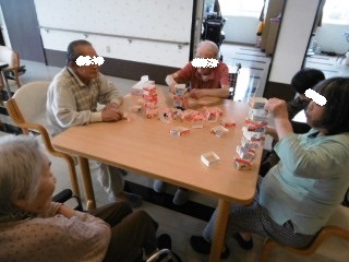 本日はテレビでみたというスタッフの声をもとに紙パックジェンガに挑戦です。写真の通り真剣に組み立てて、崩れるとそれはがっかり感がすごくありと、集中してやられているのがわかり『してやったり』狙い通りの結果で満足げなうちのリーダー。個々だけの話ですが最近、笑顔が増えているⅢ番館なのです♬