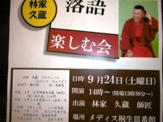 以前にも、告知させていただきましたが、9月24日土曜日になんと落語家の林家久蔵氏が来て下さいます!(^^)!